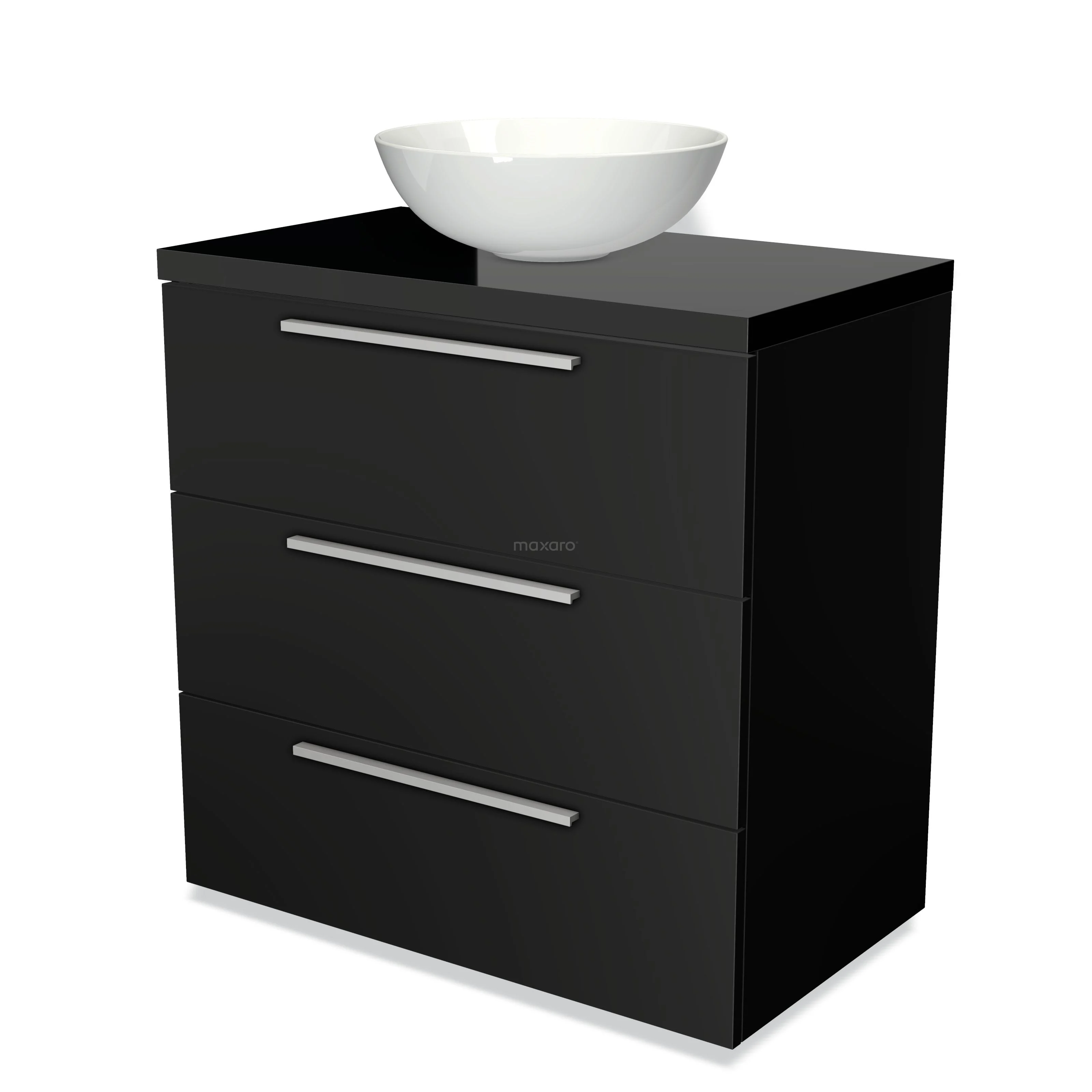 Modulo Plato Badmöbel mit Aufsatzwaschbecken | 80 cm Matt Schwarz Flach front Hochglanz Schwarz blatt 3 Schubladen