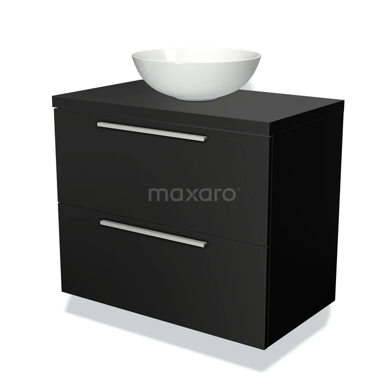 Modulo Plato Badmöbel mit Aufsatzwaschbecken | 80 cm Matt Schwarz Flach front Matt Schwarz blatt 2 übereinanderliegende Schubladen