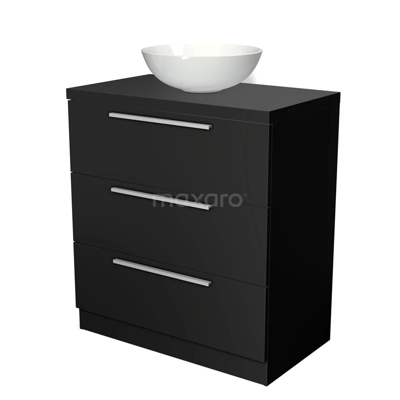Modulo Plato Badmöbel mit Aufsatzwaschbecken | 80 cm Matt Schwarz Flach front Matt Schwarz blatt 3 stehende Schubladen