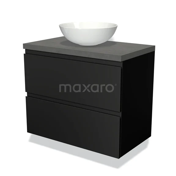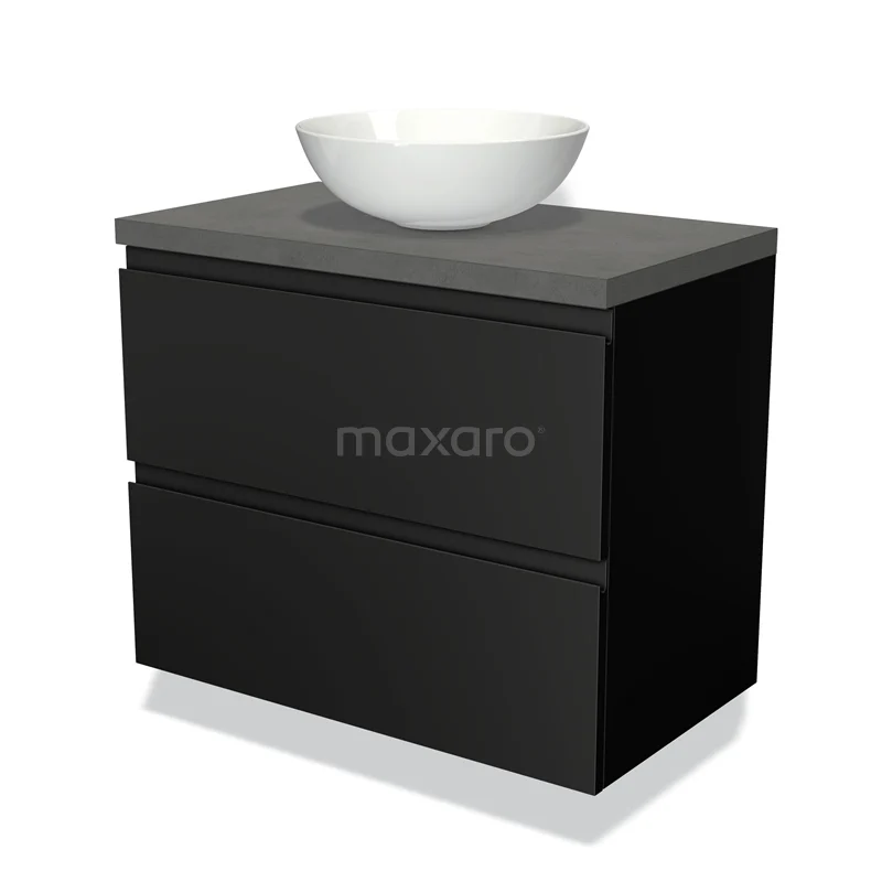 Modulo Plato Badmöbel mit Aufsatzwaschbecken | 80 cm Matt Schwarz Grifflos front Dunkelgrauer Beton blatt 2 übereinanderliegende Schubladen