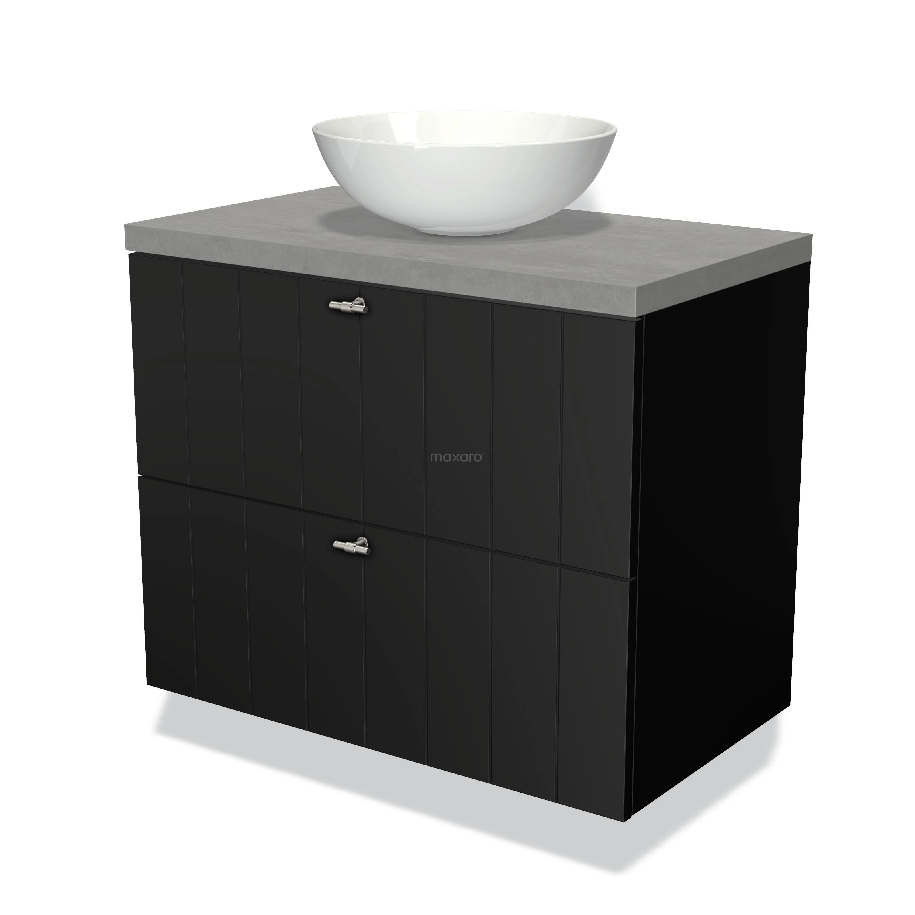 Modulo Plato Badmöbel mit Aufsatzwaschbecken | 80 cm Matt Schwarz Lamelle front Hellgrauer Beton blatt 2 übereinanderliegende Schubladen
