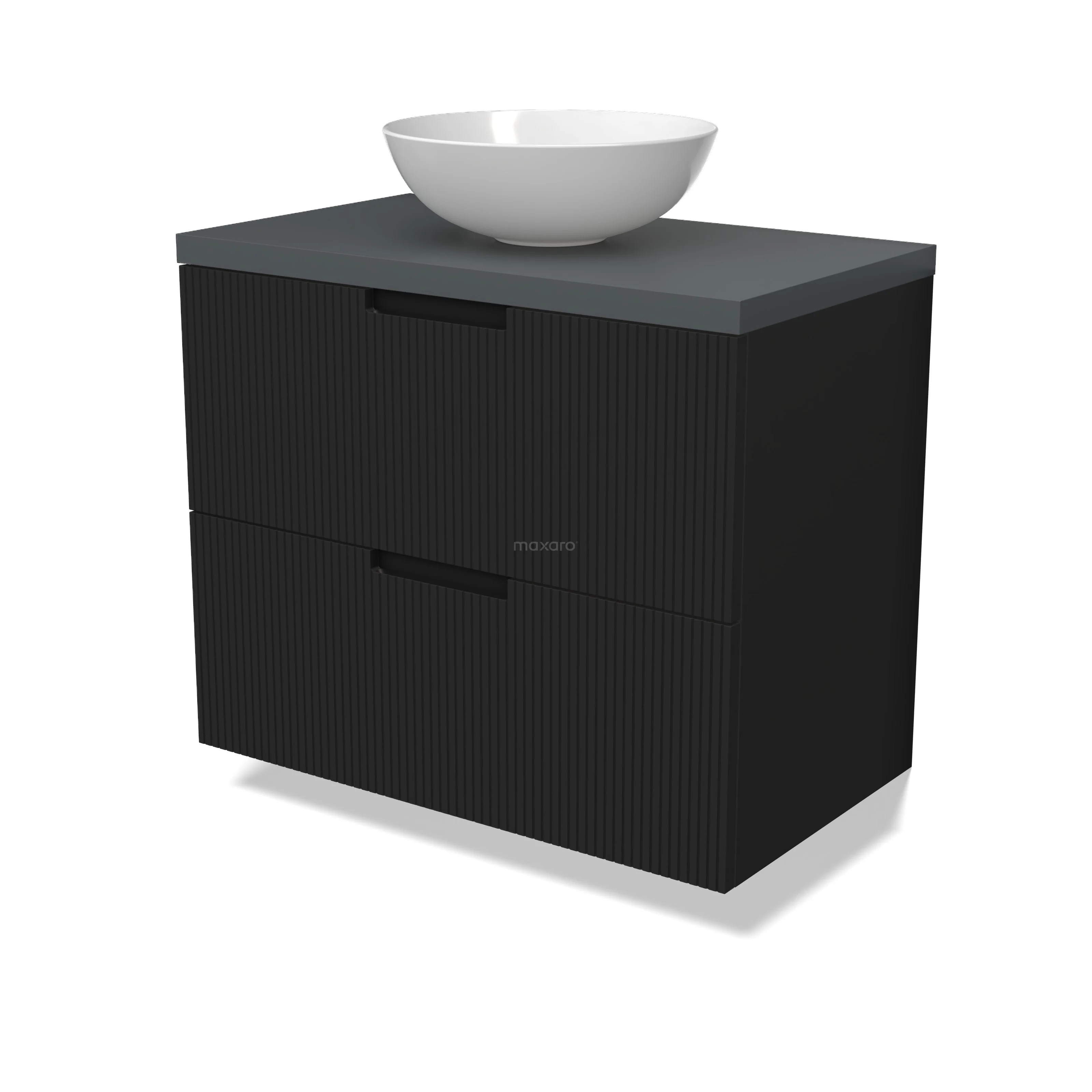 Modulo Plato Badmöbel mit Aufsatzwaschbecken | 80 cm Matt Schwarz Linie front Dunkelgrau blatt 2 übereinanderliegende Schubladen