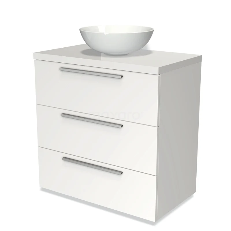 Modulo Plato Badmöbel mit Aufsatzwaschbecken | 80 cm Matt Weiß Flach front Hochglanz Weiß blatt 3 Schubladen