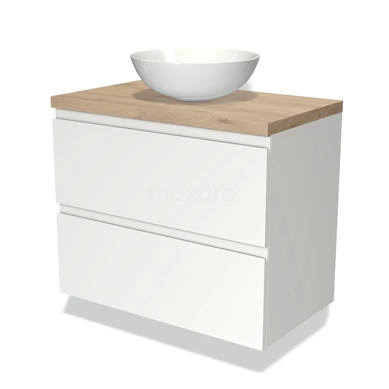 Modulo Plato Badmöbel mit Aufsatzwaschbecken | 80 cm Matt Weiß Grifflos front Hellbraune Eiche blatt 2 übereinanderliegende Schubladen