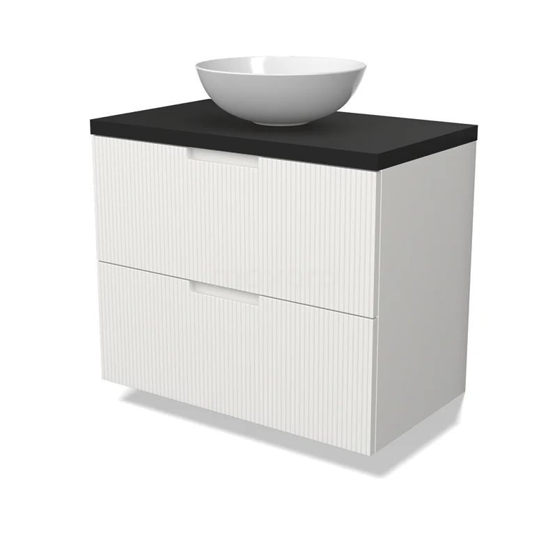 Modulo Plato Badmöbel mit Aufsatzwaschbecken | 80 cm Matt Weiß Linie front Matt Schwarz blatt 2 übereinanderliegende Schubladen