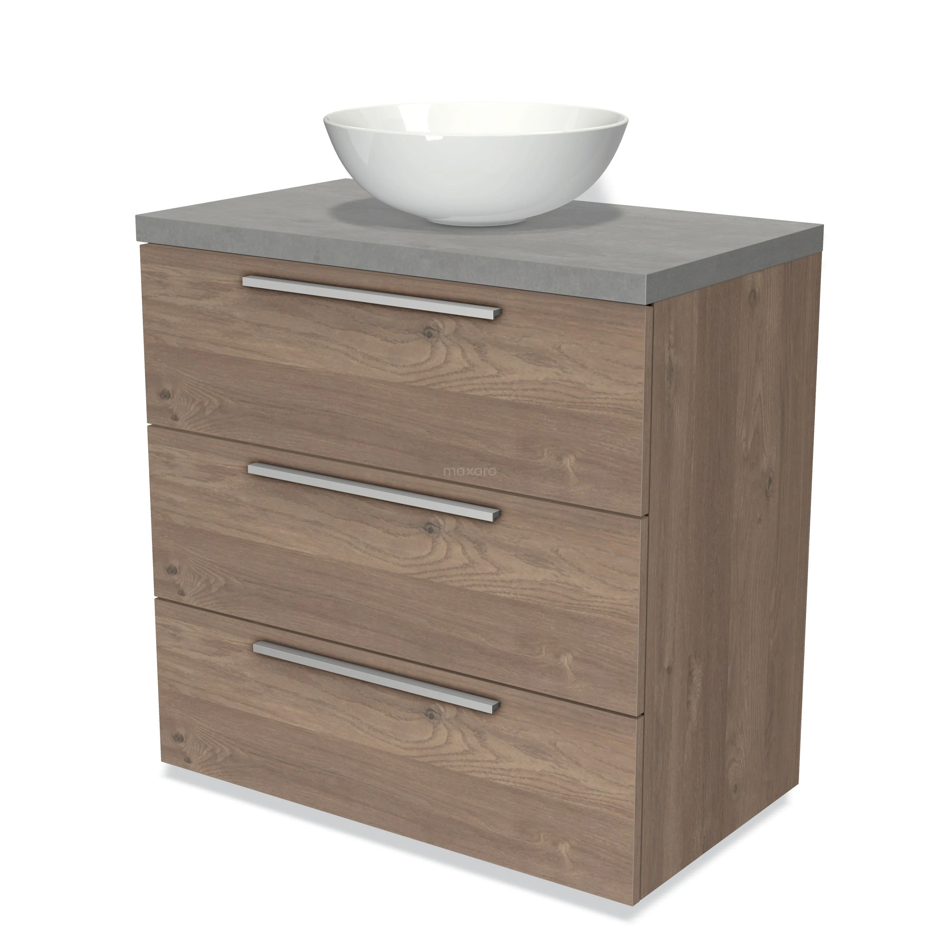 Modulo Plato Badmöbel mit Aufsatzwaschbecken | 80 cm Mittelbraune Eiche Flach front Hellgrauer Beton blatt 3 Schubladen