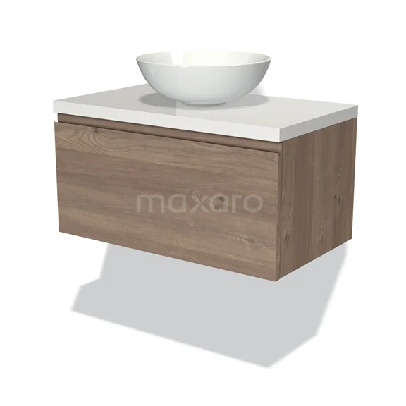 Modulo Plato Badmöbel mit Aufsatzwaschbecken | 80 cm Mittelbraune Eiche Grifflos front Hochglanz Weiß blatt 1 Schublade