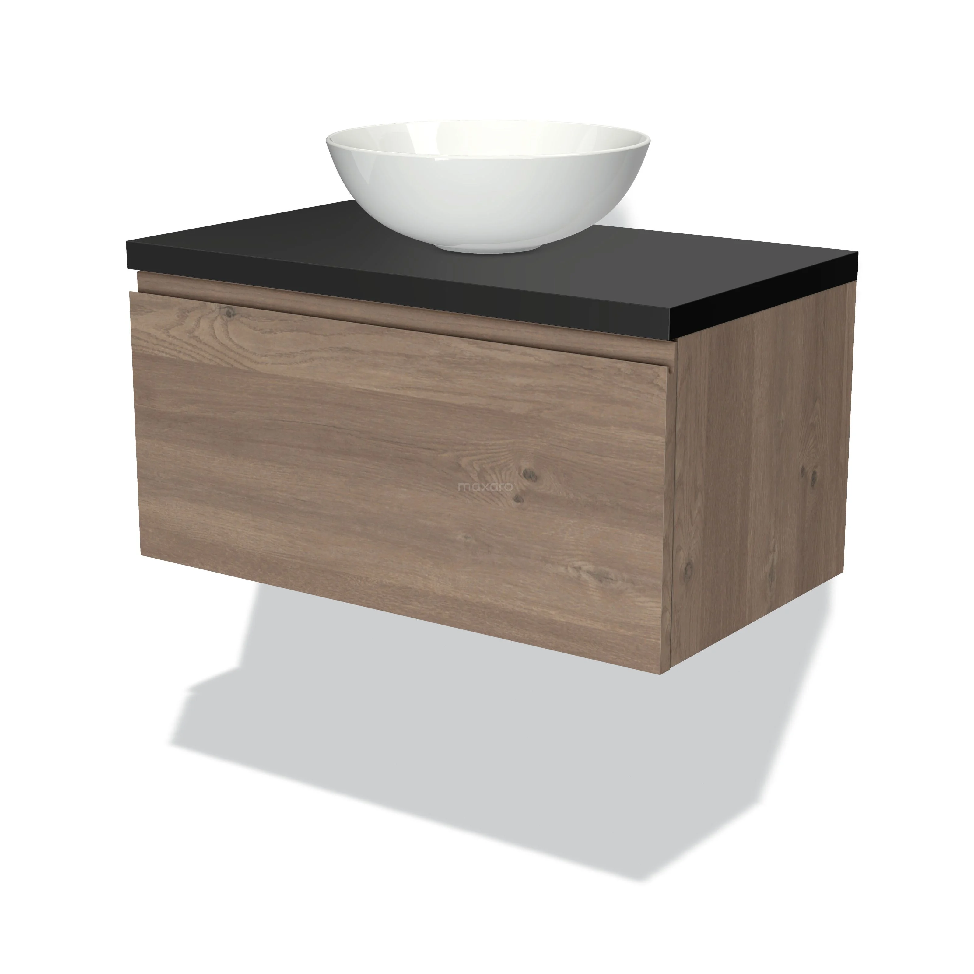 Modulo Plato Badmöbel mit Aufsatzwaschbecken | 80 cm Mittelbraune Eiche Grifflos front Matt Schwarz blatt 1 Schublade
