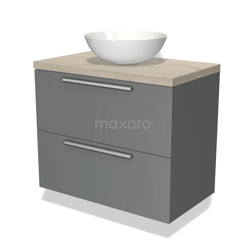 Modulo Plato Badmöbel mit Aufsatzwaschbecken | 80 cm Mittelgrau Flach front Hellgraue Eiche blatt 2 übereinanderliegende Schubladen
