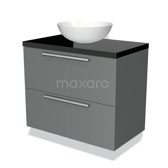Modulo Plato Badmöbel mit Aufsatzwaschbecken | 80 cm Mittelgrau Flach front Hochglanz Schwarz blatt 2 übereinanderliegende Schubladen