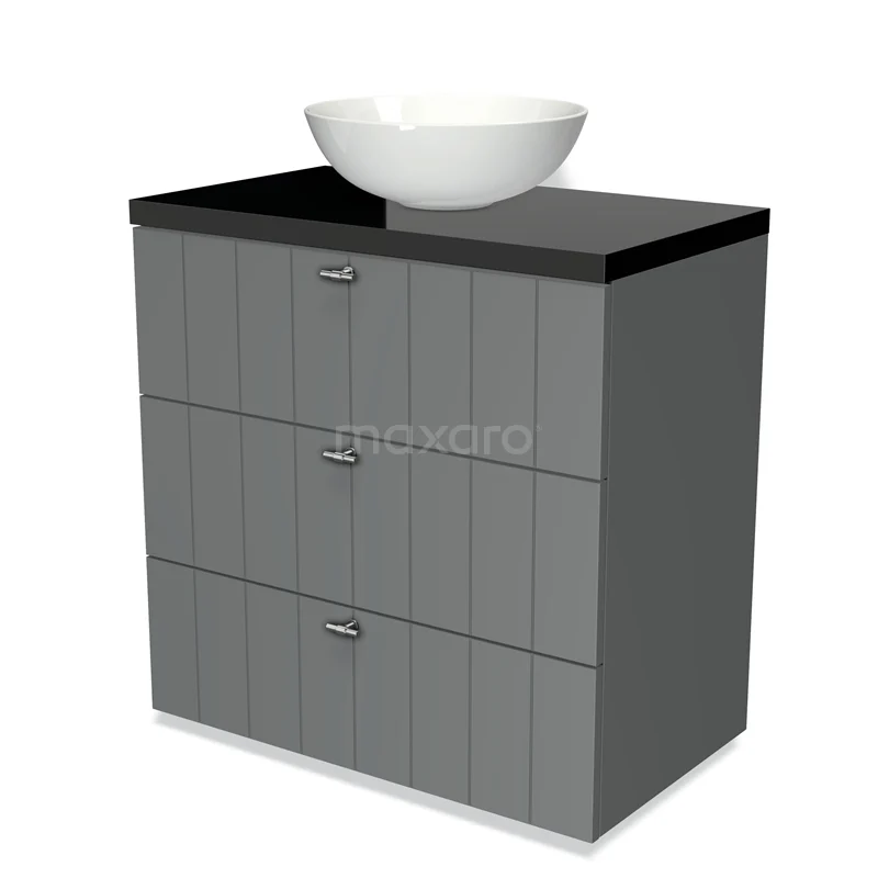 Modulo Plato Badmöbel mit Aufsatzwaschbecken | 80 cm Mittelgrau Lamelle front Hochglanz Schwarz blatt 3 Schubladen