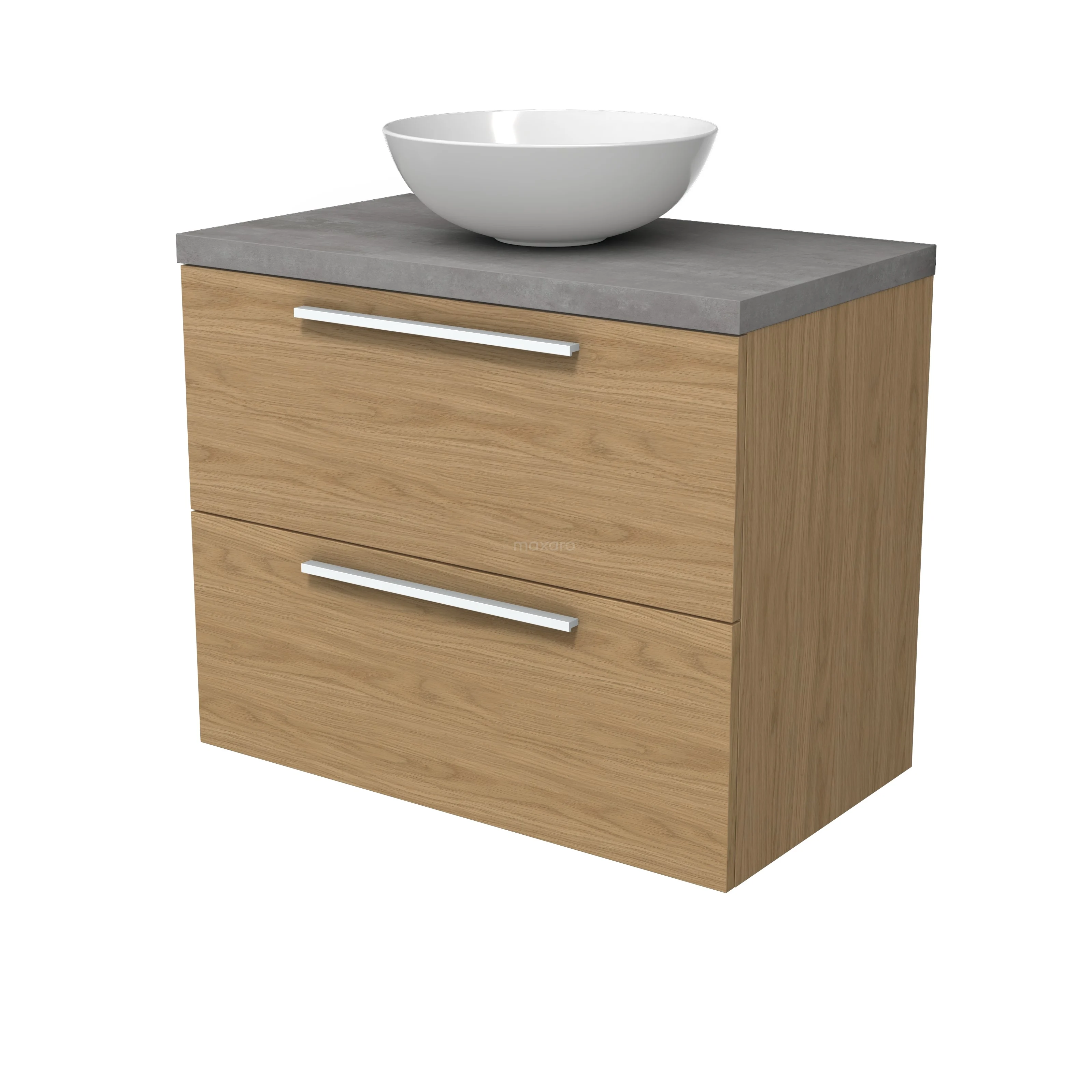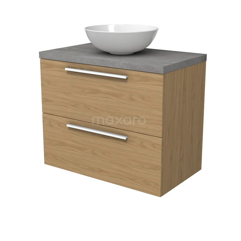Modulo Plato Badmöbel mit Aufsatzwaschbecken | 80 cm Natürliches Furnier Flach front Hellgrauer Beton blatt 2 übereinanderliegende Schubladen