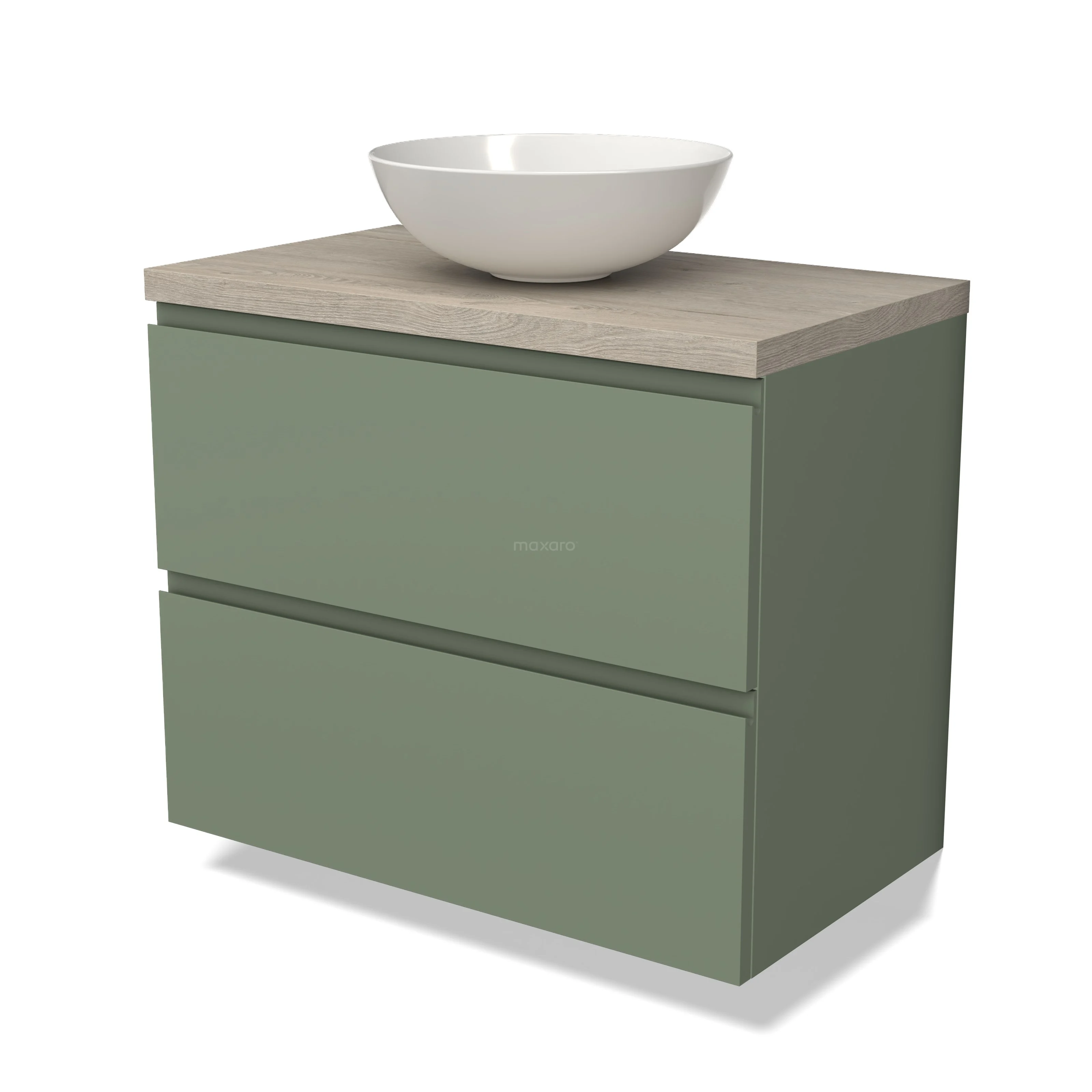 Modulo Plato Badmöbel mit Aufsatzwaschbecken | 80 cm Salbeigrün Grifflos front Hellgraue Eiche blatt 2 übereinanderliegende Schubladen