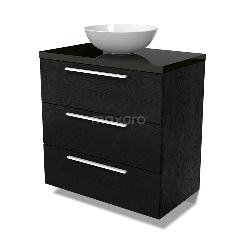 Modulo Plato Badmöbel mit Aufsatzwaschbecken | 80 cm Schwarze Eiche Flach front Hochglanz Schwarz blatt 3 Schubladen