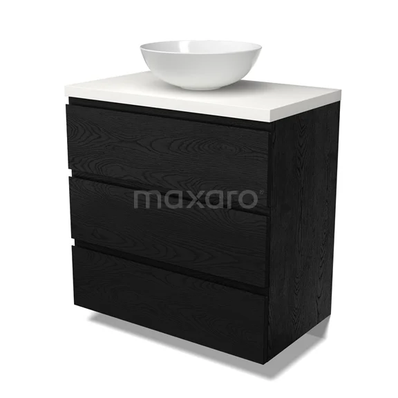Modulo Plato Badmöbel mit Aufsatzwaschbecken | 80 cm Schwarze Eiche Grifflos front Matt Weiß blatt 3 Schubladen