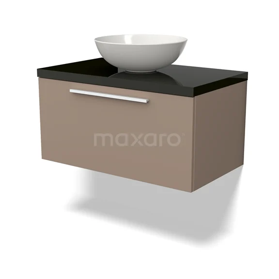 Modulo Plato Badmöbel mit Aufsatzwaschbecken | 80 cm Taupe Flach front Hochglanz Schwarz blatt 1 Schublade