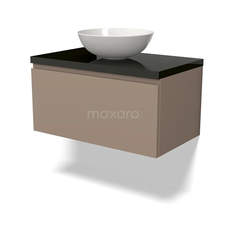 Modulo Plato Badmöbel mit Aufsatzwaschbecken | 80 cm Taupe Grifflos front Hochglanz Schwarz blatt 1 Schublade