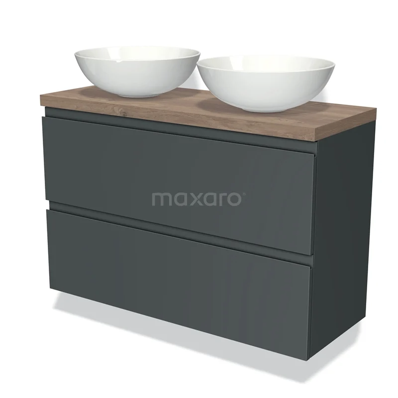 Modulo Plato Slim Badmöbel mit Aufsatzwaschbecken | 100 cm Dunkelgrau Grifflos front Mittelbraune Eiche blatt 2 übereinanderliegende Schubladen