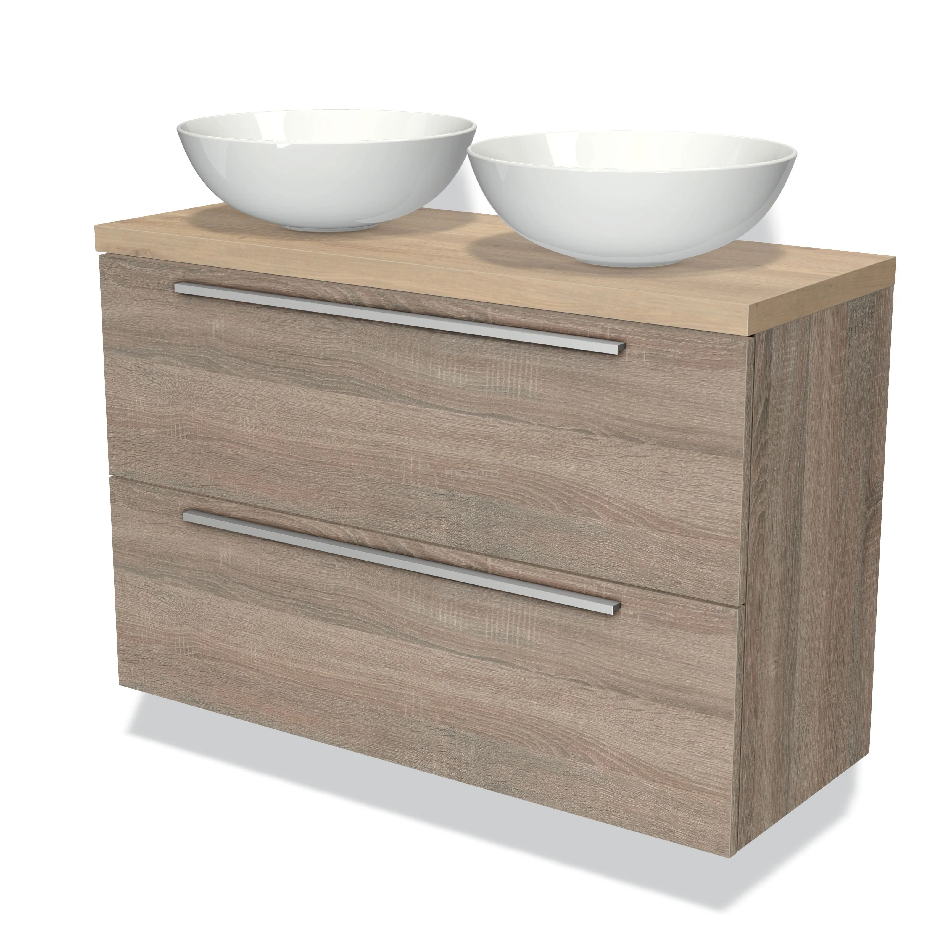 Modulo Plato Slim Badmöbel mit Aufsatzwaschbecken | 100 cm Eiche Flach front Hellbraune Eiche blatt 2 übereinanderliegende Schubladen