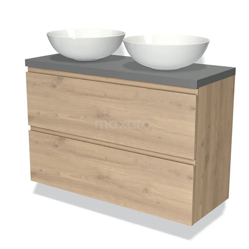 Modulo Plato Slim Badmöbel mit Aufsatzwaschbecken | 100 cm Hellbraune Eiche Grifflos front Mittelgrau blatt 2 übereinanderliegende Schubladen