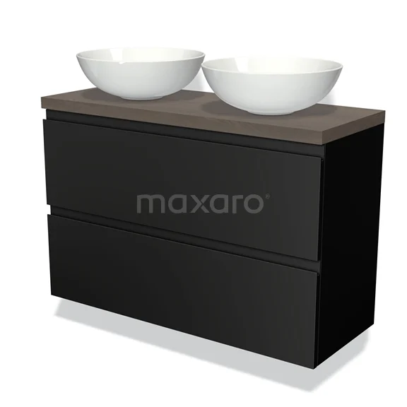 Modulo Plato Slim Badmöbel mit Aufsatzwaschbecken | 100 cm Matt Schwarz Grifflos front Dunkelbraune Eiche blatt 2 übereinanderliegende Schubladen