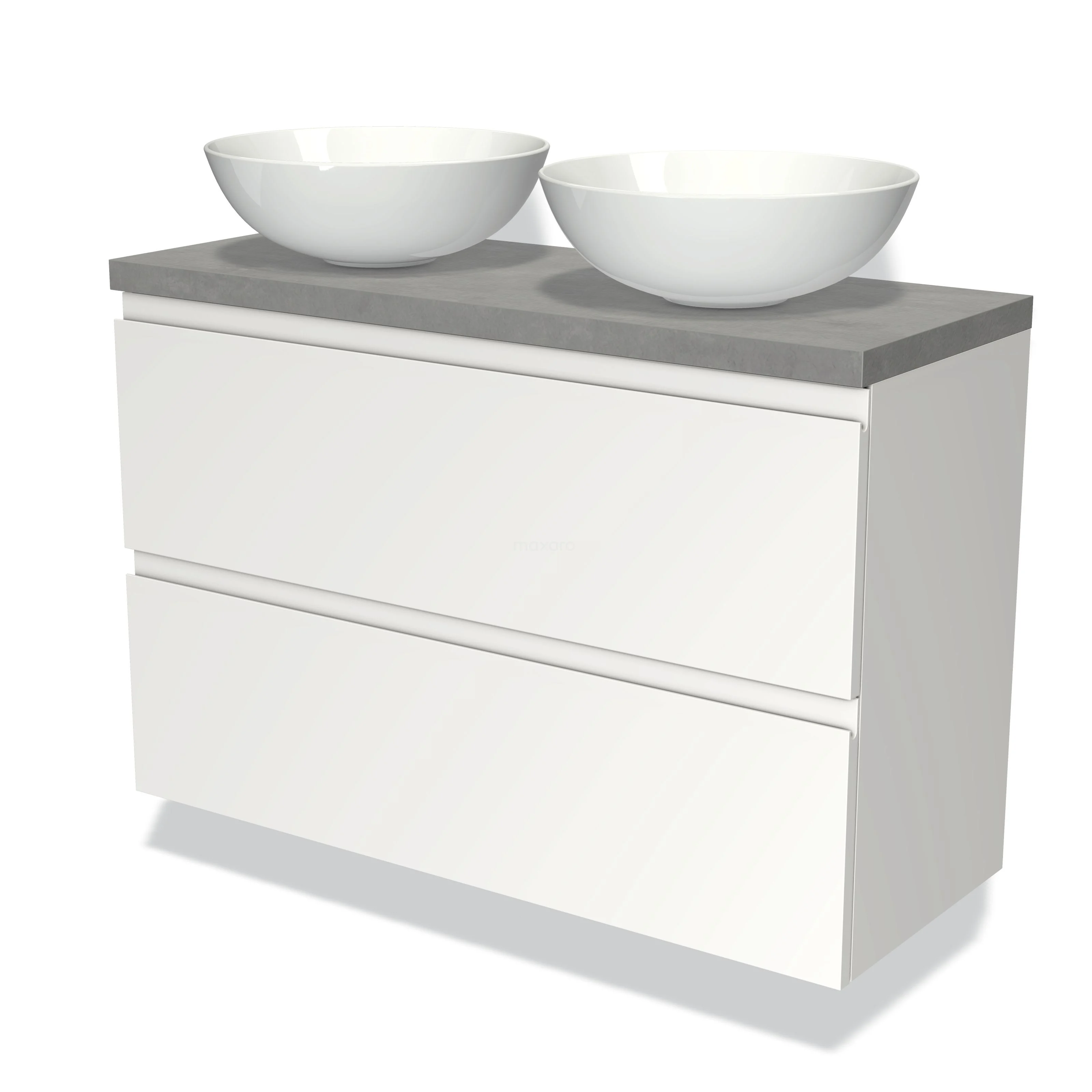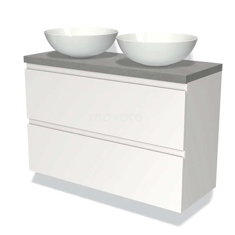 Modulo Plato Slim Badmöbel mit Aufsatzwaschbecken | 100 cm Matt Weiß Grifflos front Hellgrauer Beton blatt 2 übereinanderliegende Schubladen