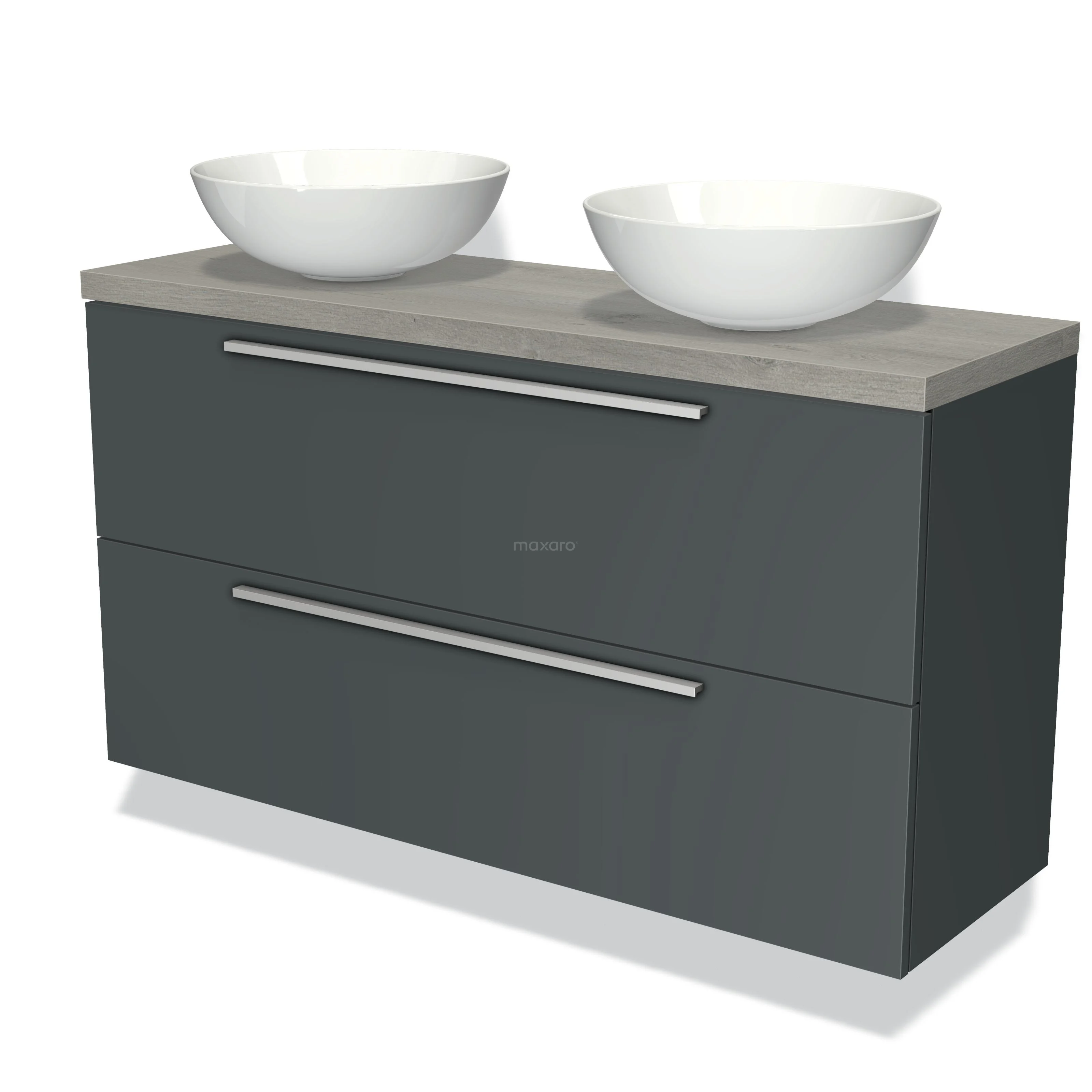 Modulo Plato Slim Badmöbel mit Aufsatzwaschbecken | 120 cm Dunkelgrau Flach front Graue Eiche blatt 2 übereinanderliegende Schubladen