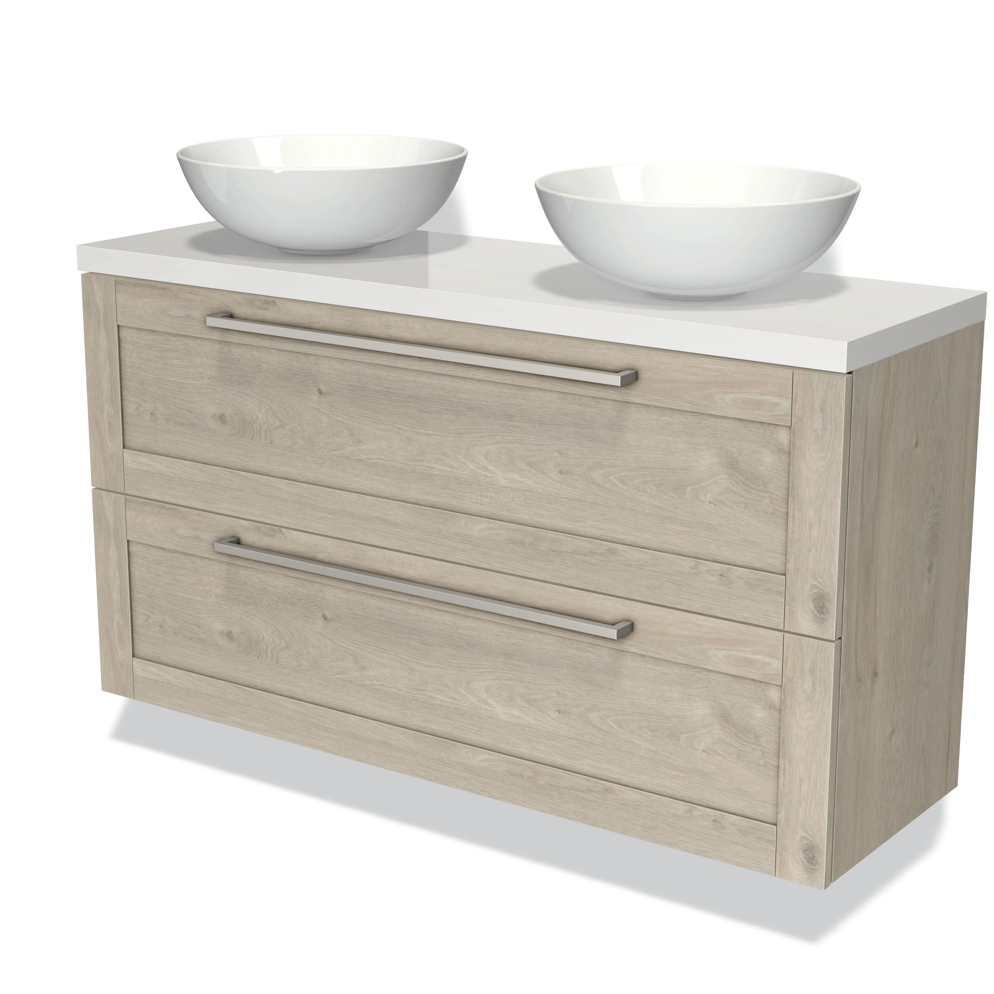 Modulo Plato Slim Badmöbel mit Aufsatzwaschbecken | 120 cm Hellgraue Eiche Rahmen front Hochglanz Weiß blatt 2 übereinanderliegende Schubladen