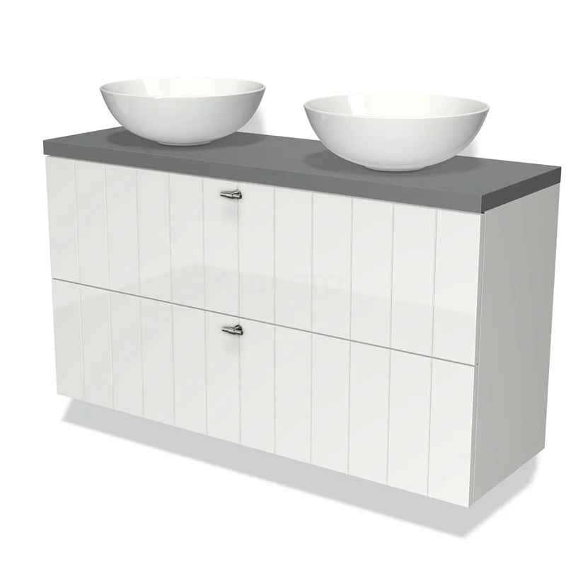 Modulo Plato Slim Badmöbel mit Aufsatzwaschbecken | 120 cm Hochglanz Weiß Lamelle front Mittelgrau blatt 2 übereinanderliegende Schubladen