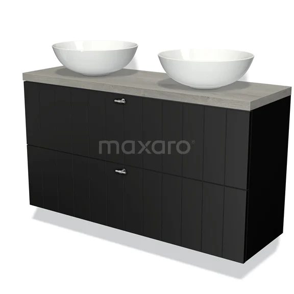 Modulo Plato Slim Badmöbel mit Aufsatzwaschbecken | 120 cm Matt Schwarz Lamelle front Graue Eiche blatt 2 übereinanderliegende Schubladen