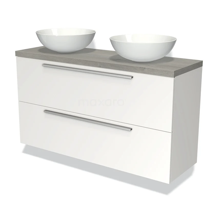 Modulo Plato Slim Badmöbel mit Aufsatzwaschbecken | 120 cm Matt Weiß Flach front Graue Eiche blatt 2 übereinanderliegende Schubladen