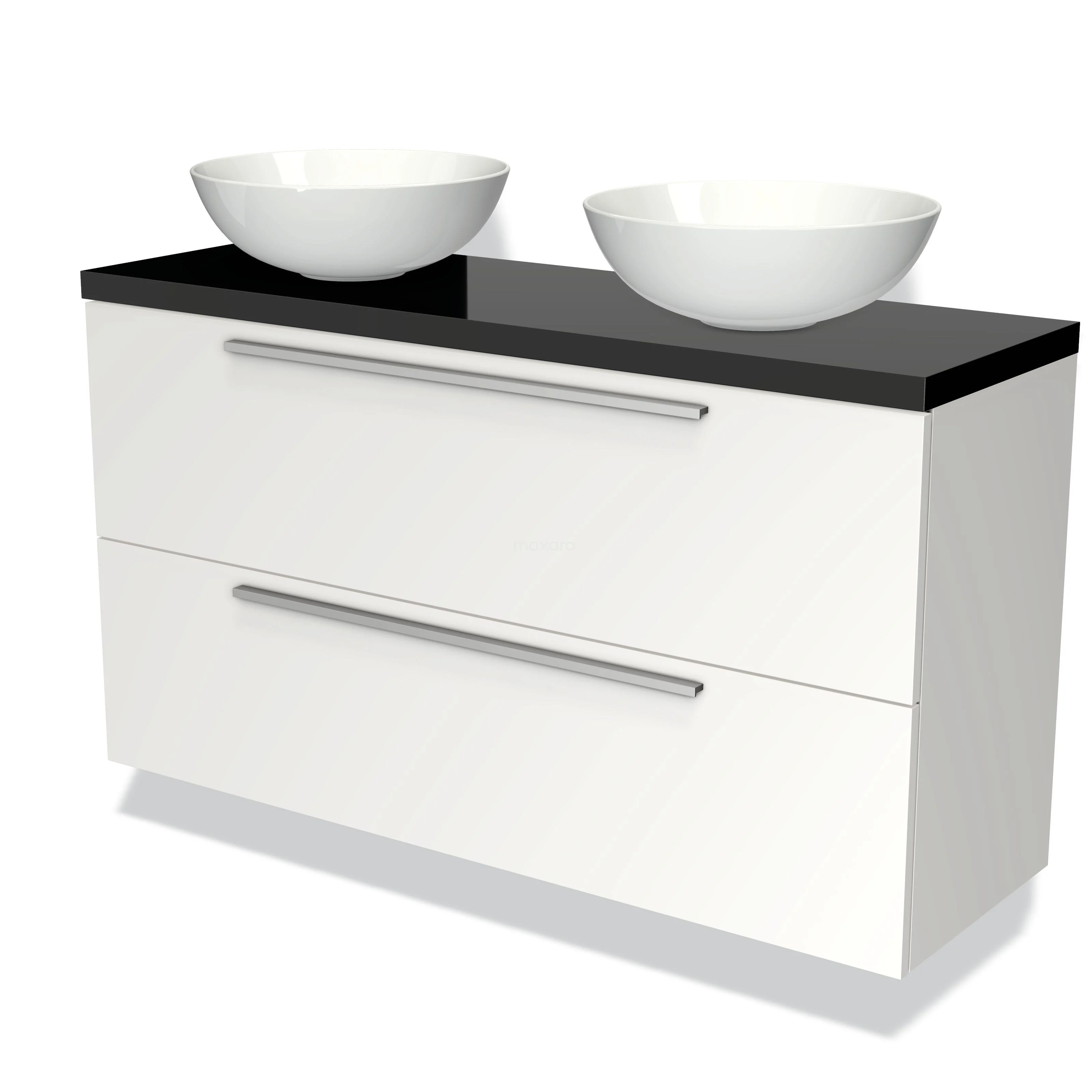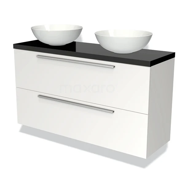 Modulo Plato Slim Badmöbel mit Aufsatzwaschbecken | 120 cm Matt Weiß Flach front Hochglanz Schwarz blatt 2 übereinanderliegende Schubladen