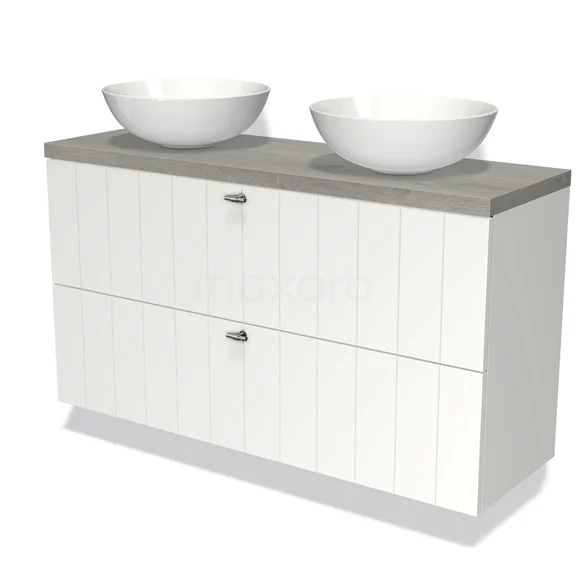 Modulo Plato Slim Badmöbel mit Aufsatzwaschbecken | 120 cm Matt Weiß Lamelle front Graue Eiche blatt 2 übereinanderliegende Schubladen