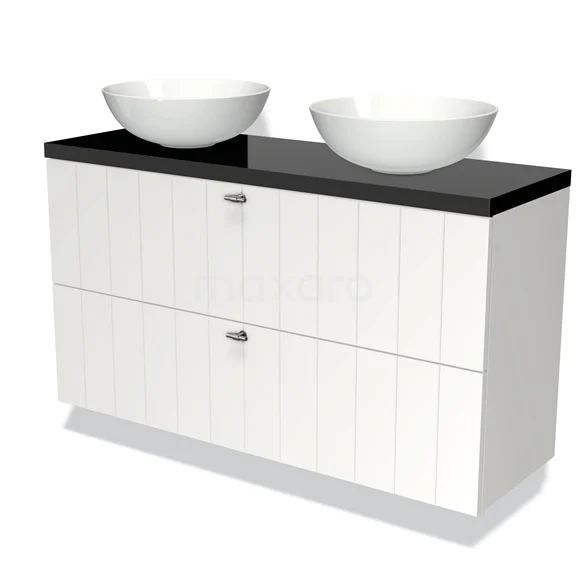 Modulo Plato Slim Badmöbel mit Aufsatzwaschbecken | 120 cm Matt Weiß Lamelle front Hochglanz Schwarz blatt 2 übereinanderliegende Schubladen