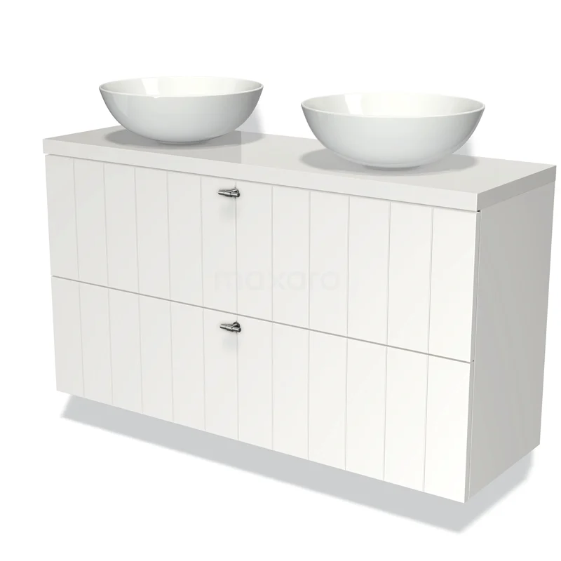 Modulo Plato Slim Badmöbel mit Aufsatzwaschbecken | 120 cm Matt Weiß Lamelle front Hochglanz Weiß blatt 2 übereinanderliegende Schubladen