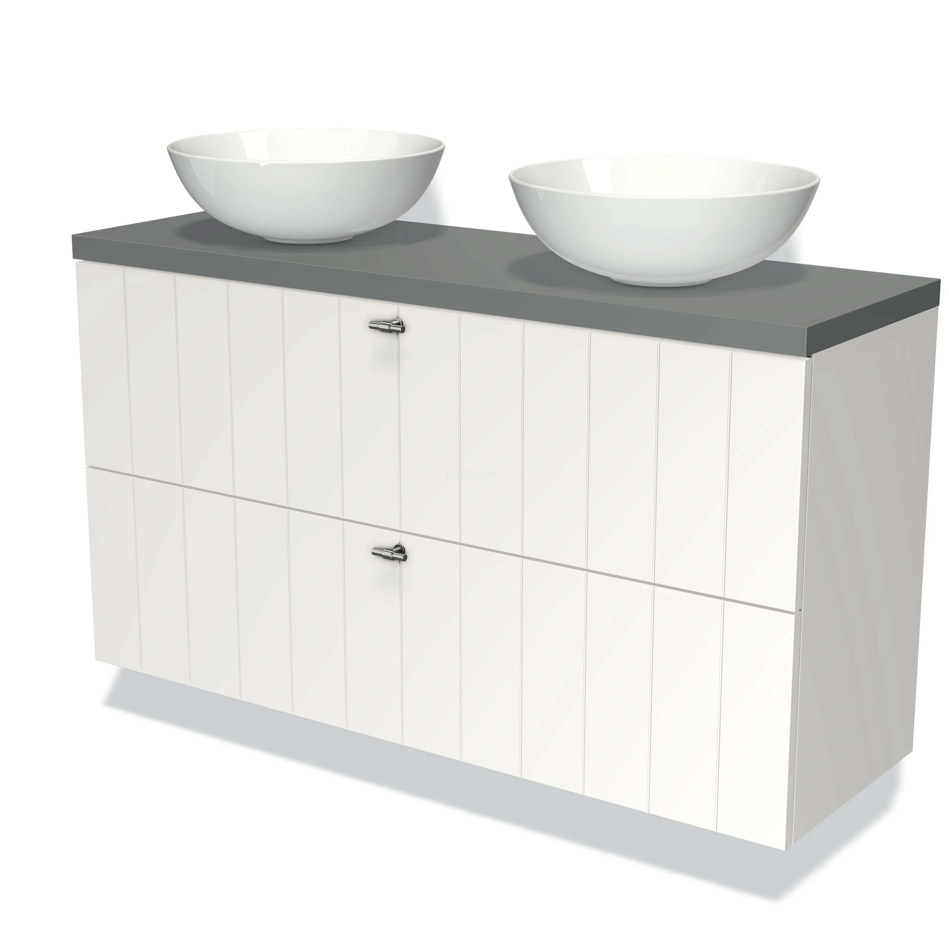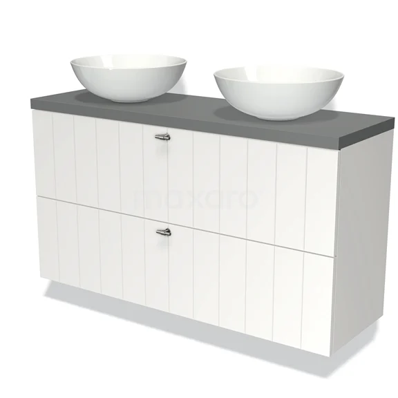 Modulo Plato Slim Badmöbel mit Aufsatzwaschbecken | 120 cm Matt Weiß Lamelle front Mittelgrau blatt 2 übereinanderliegende Schubladen