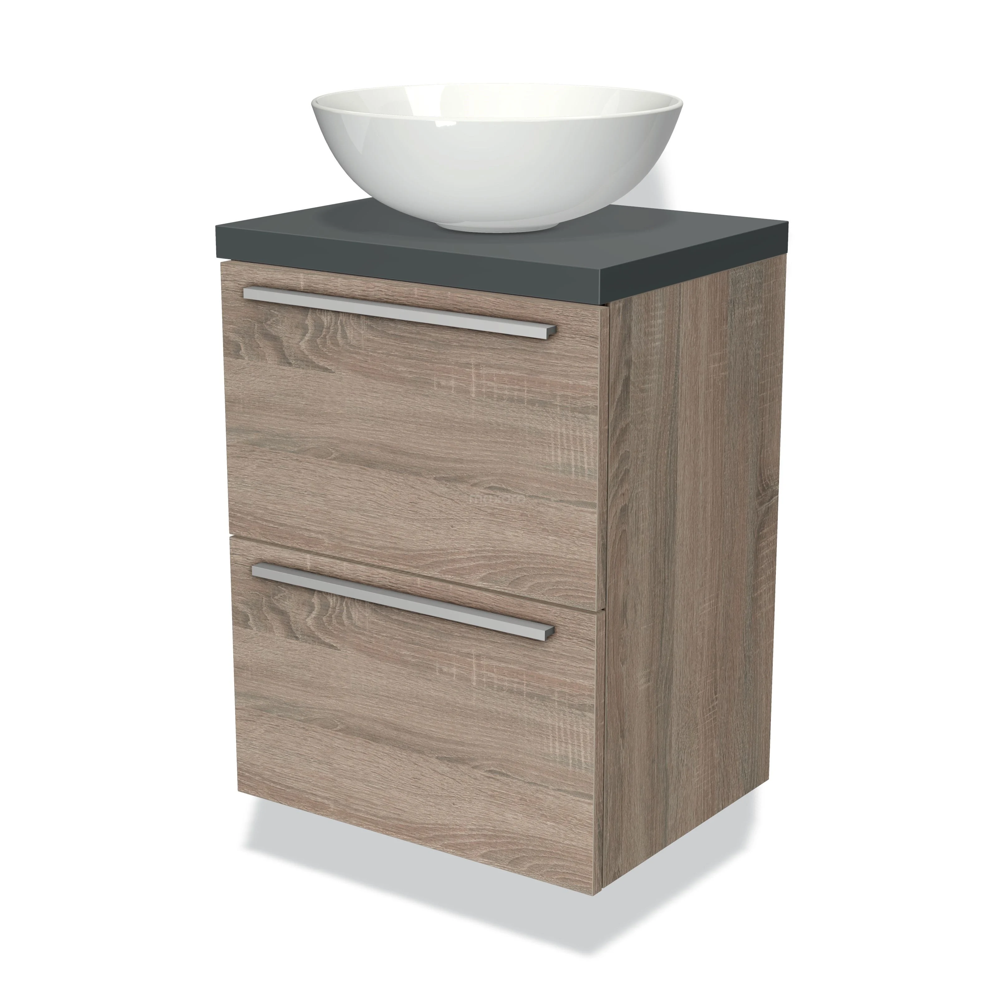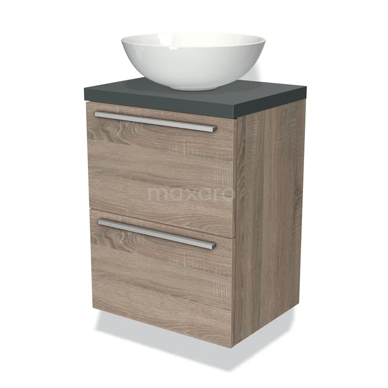 Modulo Plato Slim Badmöbel mit Aufsatzwaschbecken | 50 cm Eiche Flach front Dunkelgrau blatt 2 übereinanderliegende Schubladen