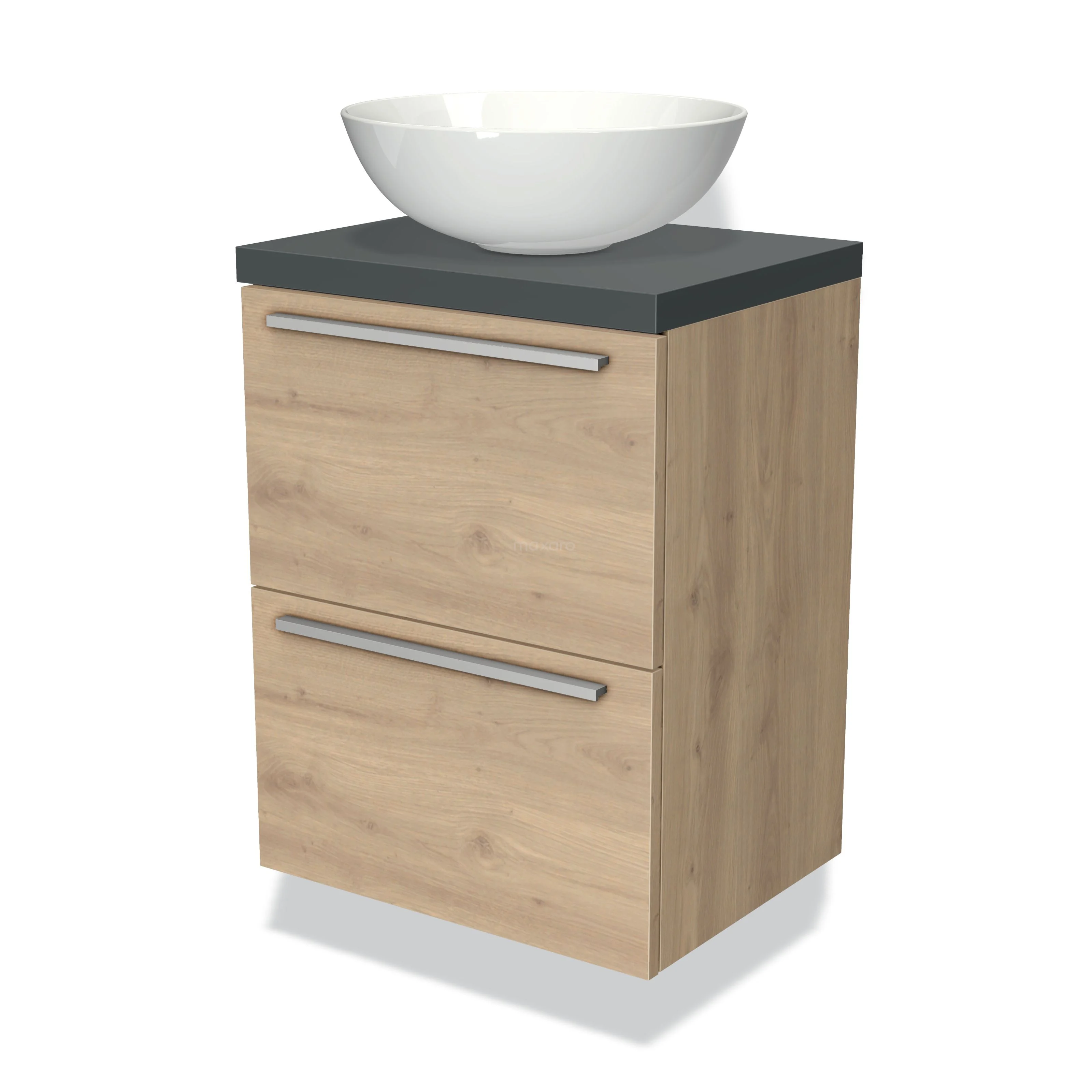 Modulo Plato Slim Badmöbel mit Aufsatzwaschbecken | 50 cm Hellbraune Eiche Flach front Dunkelgrau blatt 2 übereinanderliegende Schubladen