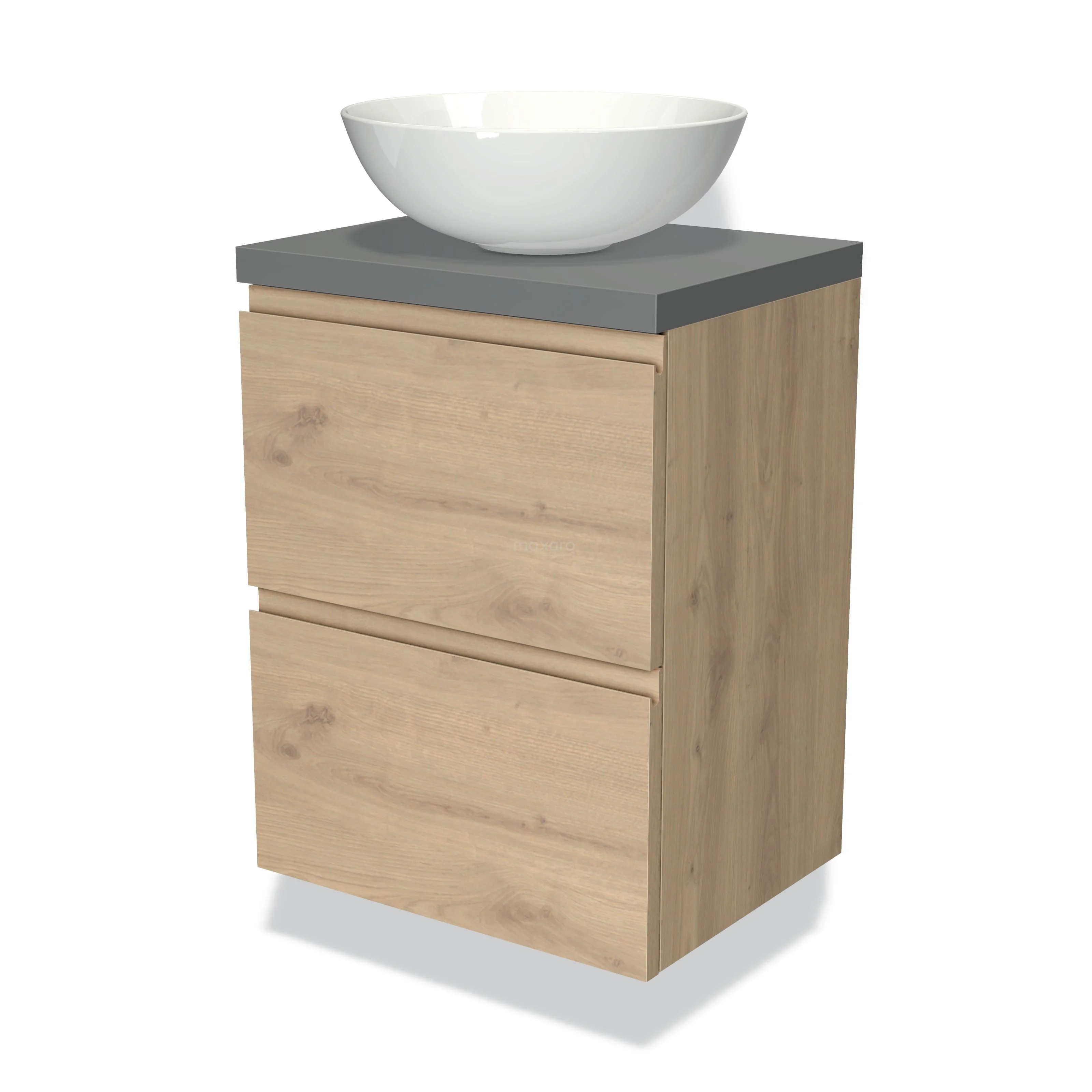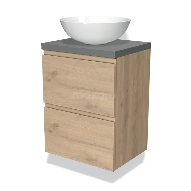 Modulo Plato Slim Badmöbel mit Aufsatzwaschbecken | 50 cm Hellbraune Eiche Grifflos front Mittelgrau blatt 2 übereinanderliegende Schubladen