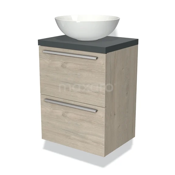 Modulo Plato Slim Badmöbel mit Aufsatzwaschbecken | 50 cm Hellgraue Eiche Flach front Dunkelgrau blatt 2 übereinanderliegende Schubladen