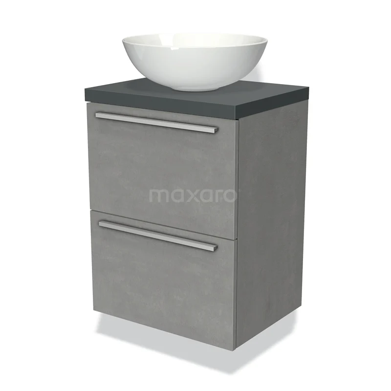 Modulo Plato Slim Badmöbel mit Aufsatzwaschbecken | 50 cm Hellgrauer Beton Flach front Dunkelgrau blatt 2 übereinanderliegende Schubladen