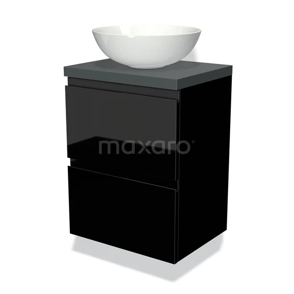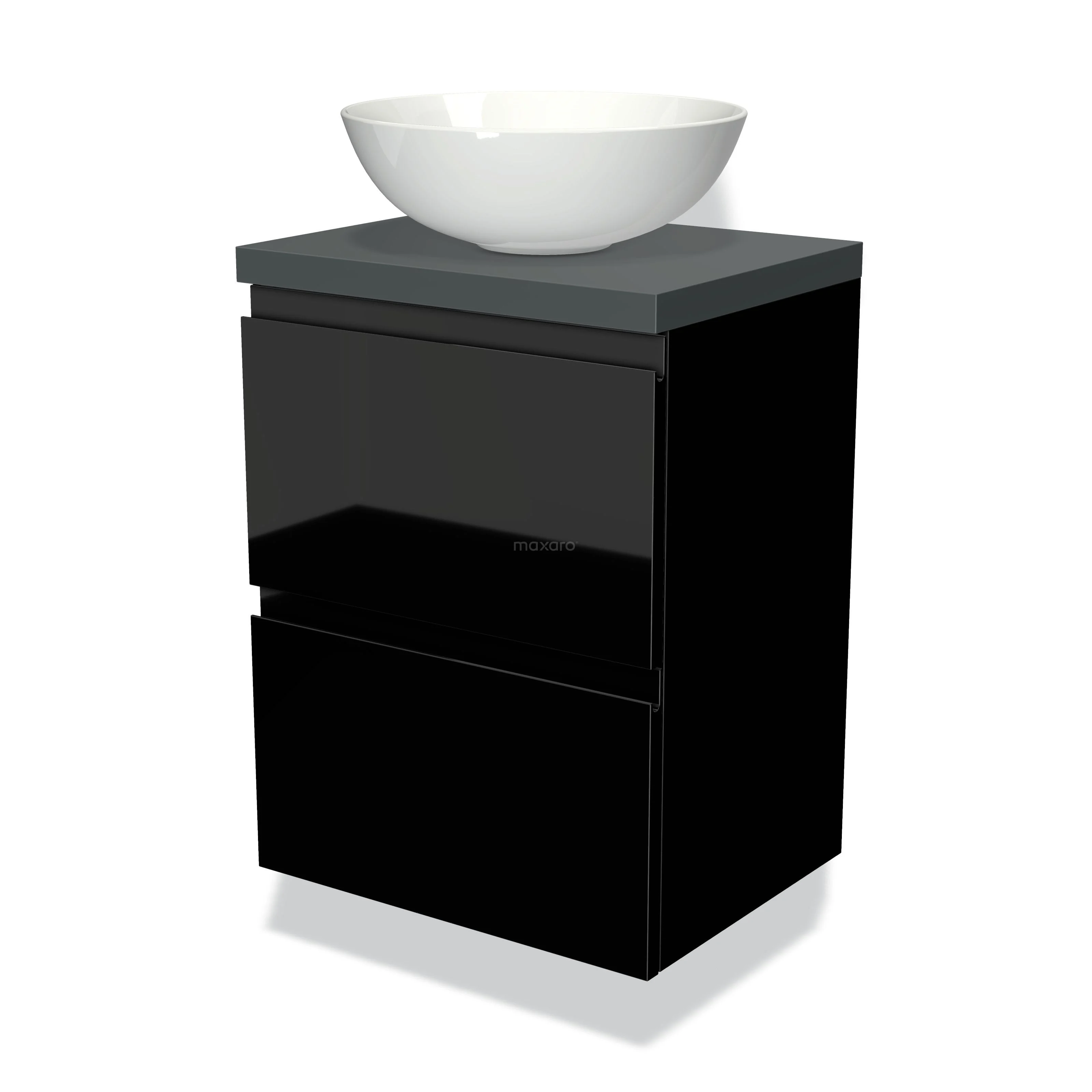 Modulo Plato Slim Badmöbel mit Aufsatzwaschbecken | 50 cm Hochglanz Schwarz Grifflos front Dunkelgrau blatt 2 übereinanderliegende Schubladen