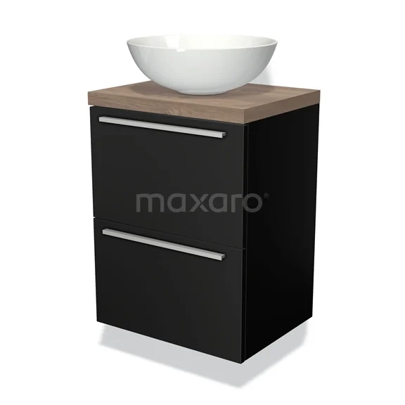 Modulo Plato Slim Badmöbel mit Aufsatzwaschbecken | 50 cm Matt Schwarz Flach front Mittelbraune Eiche blatt 2 übereinanderliegende Schubladen