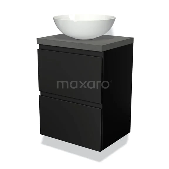 Modulo Plato Slim Badmöbel mit Aufsatzwaschbecken | 50 cm Matt Schwarz Grifflos front Dunkelgrauer Beton blatt 2 übereinanderliegende Schubladen