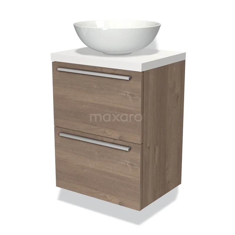 Modulo Plato Slim Badmöbel mit Aufsatzwaschbecken | 50 cm Mittelbraune Eiche Flach front Matt Weiß blatt 2 übereinanderliegende Schubladen