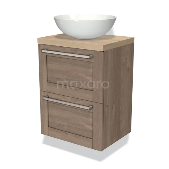 Modulo Plato Slim Badmöbel mit Aufsatzwaschbecken | 50 cm Mittelbraune Eiche Rahmen front Hellbraune Eiche blatt 2 übereinanderliegende Schubladen