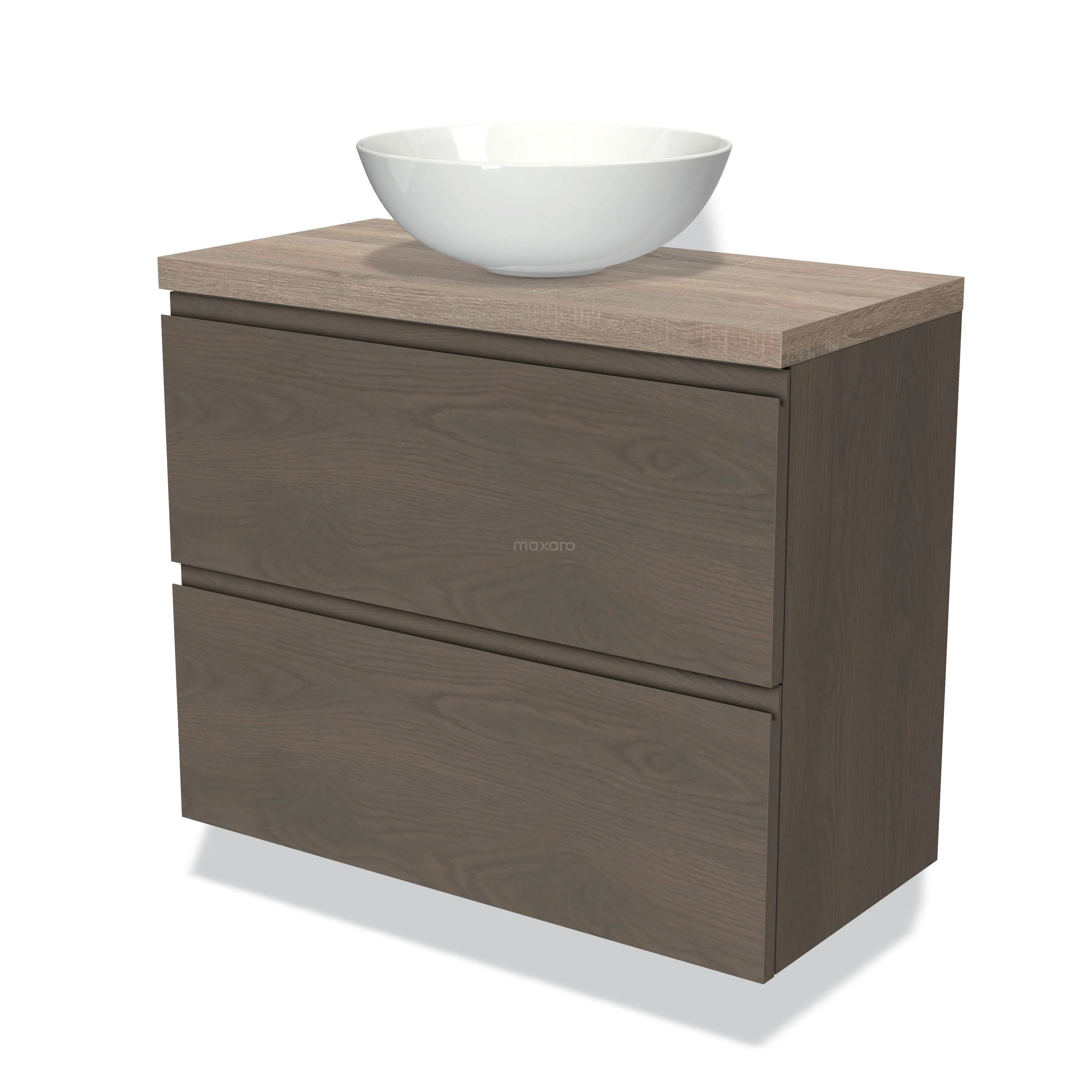 Modulo Plato Slim Badmöbel mit Aufsatzwaschbecken | 80 cm Dunkelbraune Eiche Grifflos front Eiche blatt 2 übereinanderliegende Schubladen