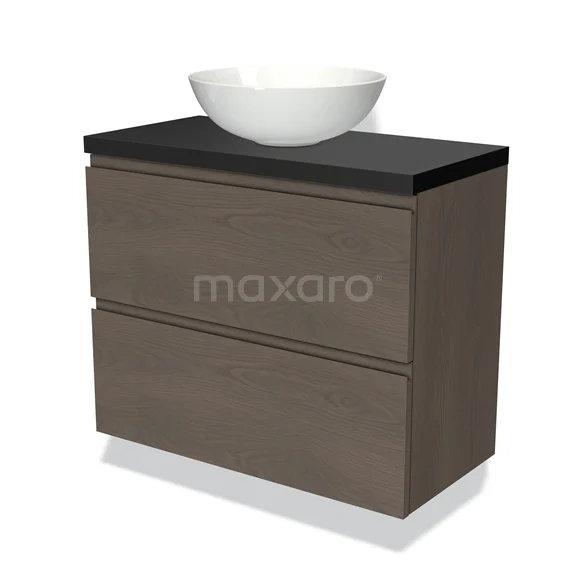 Modulo Plato Slim Badmöbel mit Aufsatzwaschbecken | 80 cm Dunkelbraune Eiche Grifflos front Matt Schwarz blatt 2 übereinanderliegende Schubladen
