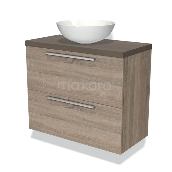 Modulo Plato Slim Badmöbel mit Aufsatzwaschbecken | 80 cm Eiche Flach front Dunkelbraune Eiche blatt 2 übereinanderliegende Schubladen
