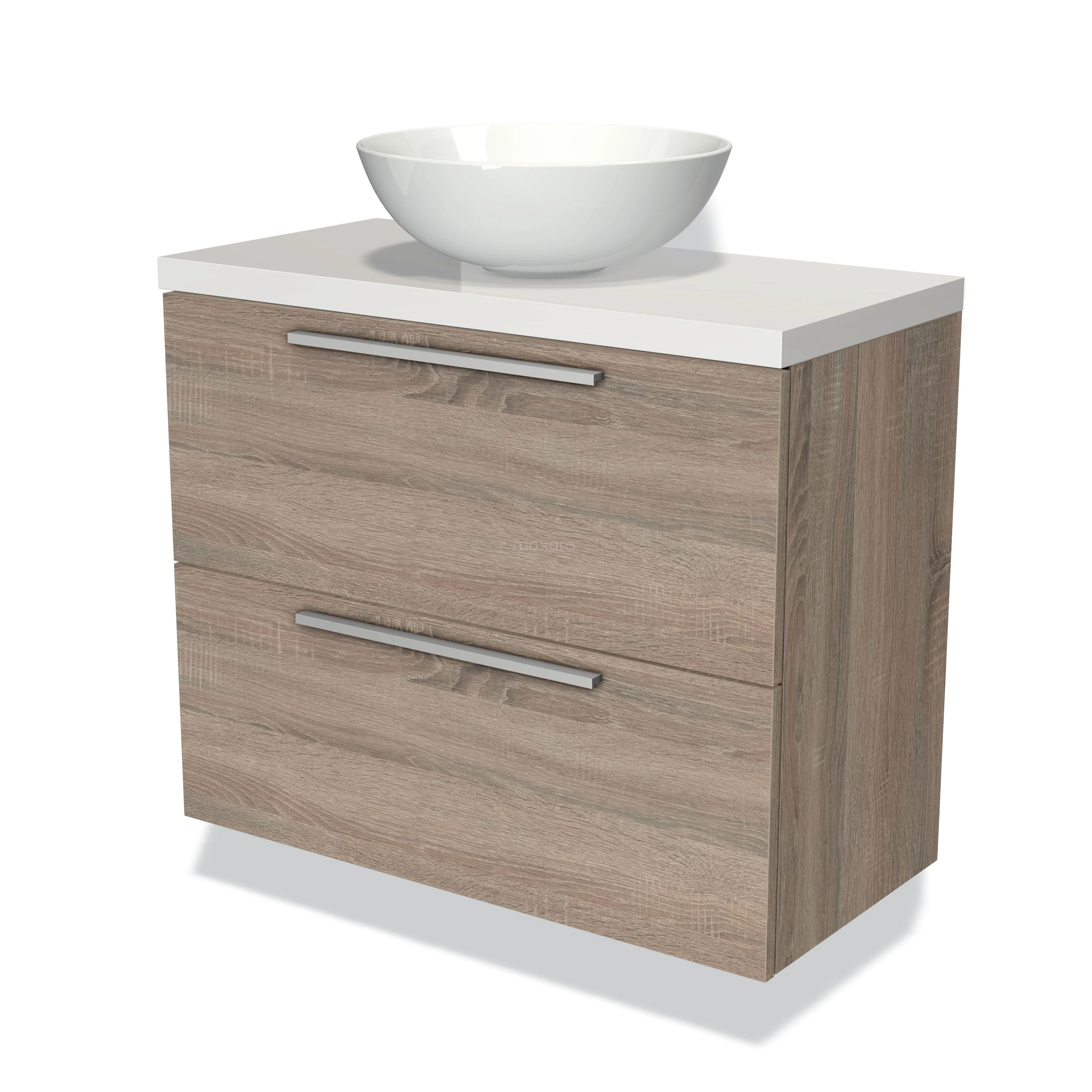 Modulo Plato Slim Badmöbel mit Aufsatzwaschbecken | 80 cm Eiche Flach front Hochglanz Weiß blatt 2 übereinanderliegende Schubladen